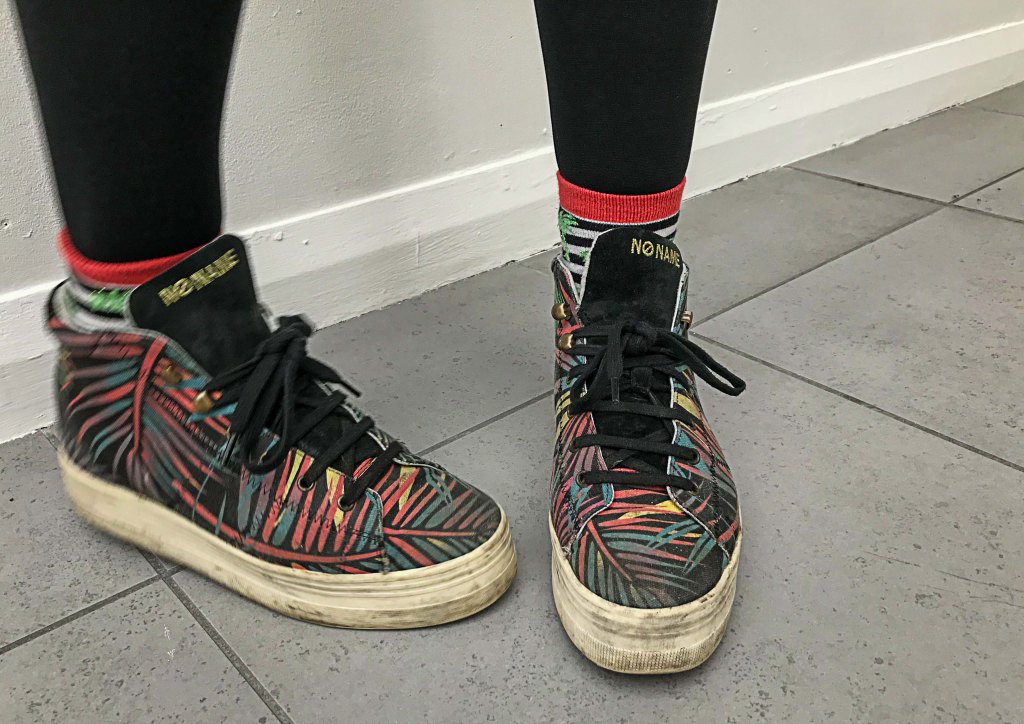 “When I first tried them on I felt they were really clunky and that they did not look good on me at all because I am so tall, and that I would look like a bit of a brat with huge feet or something. Then I realised that they are actually, really cool which is why I bought them in the first place, but on a night out they are just the perfect shoe. They are the perfect shoe for shopping, dancing, any form of exercise. They say that I have a unique style. I don’t like to have shoes like everybody else, I like to be different…I like to wear them with funky socks.”
